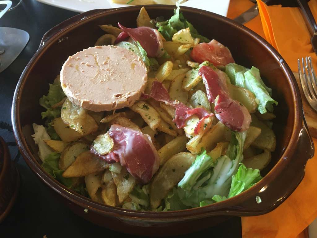 In a bowl that could comfortably hold a full-sized cat, a mix of greens and tomatoes, surprise bursts of smoked duck breast, a tranche of foie gras, and topped, literally covered with a fragrant crispy layer of garlic deep-fried potatoes, the dressing a simple emulsion of oil and vinegar with something that might be tarragon. The menu lists it as the “Salad Gascon”, but we refer to it as “The Holy Crap Salad”. Once, when trying to google the address to give to a friend, a Tripadvisor review popped up which opened with the line, “Holy crap, this salad is amazing!” and ever since…