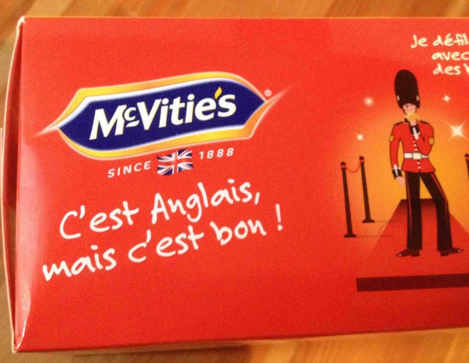 In the UK, there’s a brand of biscuits – McVite’s – which are ubiquitous over there, and when I was a young and backpacking gypsy I pretty much survived on them. The flagship variety is the poorly named “Wholemeal Digestive”, but it’s really quite delicious, sort of a dense graham-crackery thing. When I returned to the states after traveling, I sought them out at specialty stores, paid a lot more for them, and indulged only rarely. Now, in France, they’re readily available, and almost cheaper than in the UK, so I gorge myself regularly. I noticed this bit of cultural illumination on the package the other day, sort of indicative of the relationship between Great Britain and France: