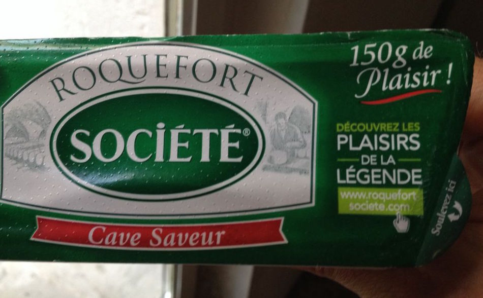 Couple of things here (this is a readily available Roquefort): the words in red are “cave saveur”, which basically translates as “cave flavor”. In the cheese world this is a good thing. But what caught my eye was the “150g de plaisir!”, or “150 grams of Pleasure!” Which, ya know, may or may not have been my nickname in college…