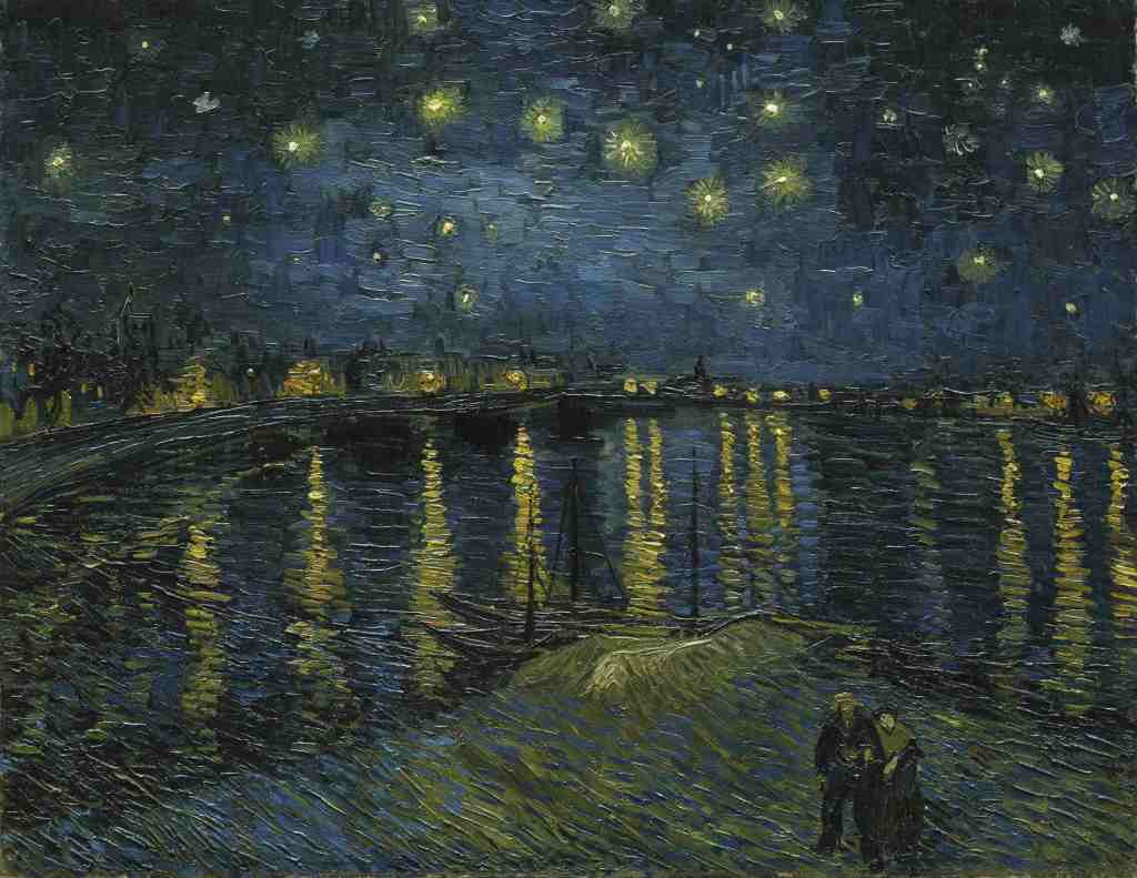Look at a map of the southern Rhône (or imagine yourself a migratory stork peering down from rarer air), reaching towards the Mediterranean in splay-fingered hand, a 360 square mile variegated delta of marsh and salt flats. This is la Camargue. Arles is a bracelet on that hand, just where the Grand Rhône and Petit Rhône splinter apart, Languedoc to the west, Provence to the east. The main flow does a little zig to the east as it passes through town, and just where it zags back west is pretty much exactly where Van Gogh stood to paint ‘Starry Night Over the Rhône”