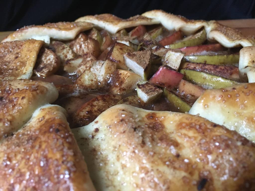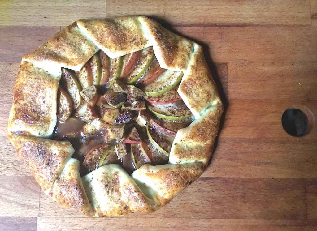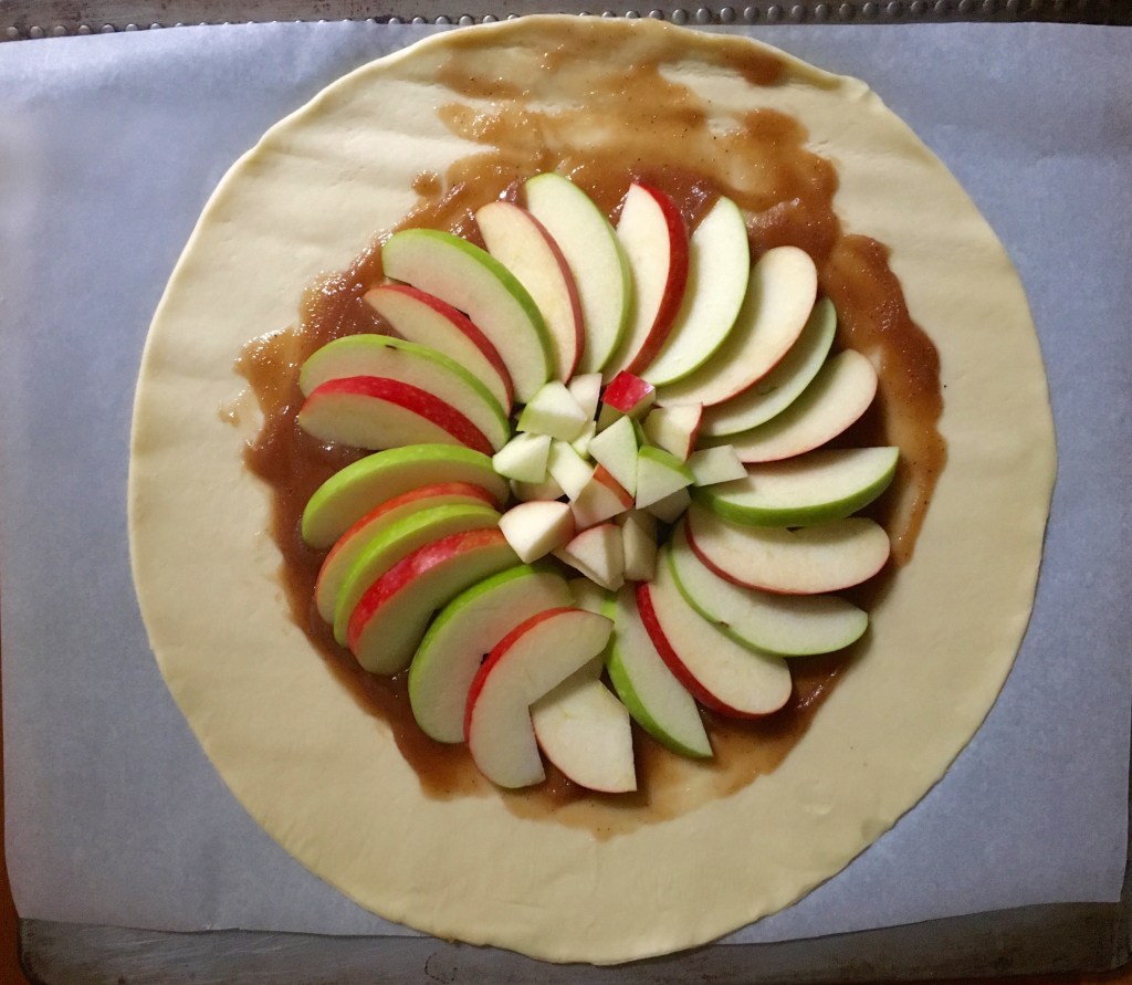 Preheat the oven to 400°F/205°C. Roll the chilled dough out into a 12”/30cm circle, and place on parchment paper on a baking sheet. Spread the chestnut crème in an even circle, leaving about 1 ½” border (this is where Maddie took poetic license) and arrange the apple slices in a sort of intricate fan/circle arrangement, or just toss ’em all in as a jumble.