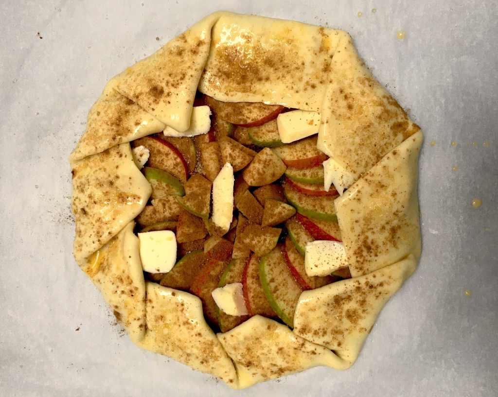 Sprinkle the lemon juice over the apple slices, followed by a dusting of sugar and cinnamon, and scatter the chunks of butter. Fold the uncovered edges over in overlapping folds. Brush with the beaten egg and dust with coarse sugar and a bit more cinnamon for good measure.